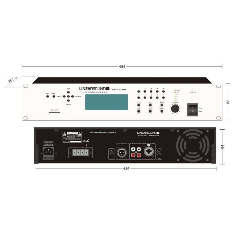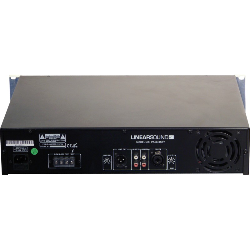 This amplifier is designed for quality installations. It has 4 outputs (70 - 100V and 4 - 16Ohms), a VOX level control and a volume controller on the front panel. For the mixing part, there is an override IN, 2 RCA LINE/AUX, a pre output on XLR. It also has a SD card player for MP3 files (16GB). The playing mode is administrated by a built-in powerful timer. Programs can be broadcasted whenever wanted or on 24 hours mode.Recipient :