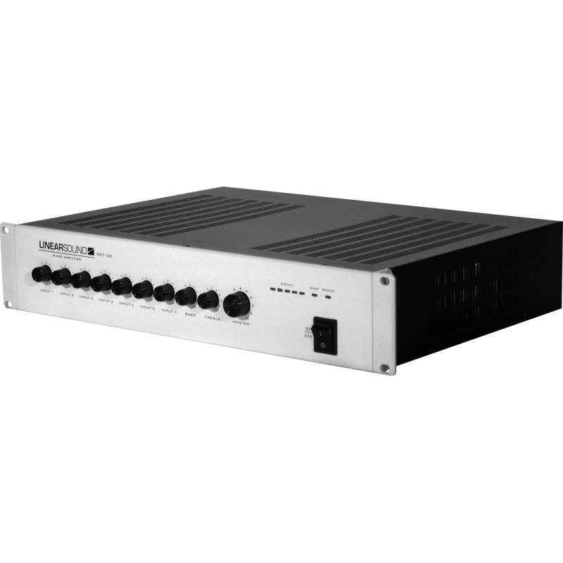 The 7-channel amplifier-preamplifier PA7120 is designed to broadcast messages and background music. It has 5 balanced MIC LINE inputs (one with Voice Over) and 2 stereo LINE inputs. It also has a dip-switch, a phantom power supply, a VCA control... Input and output levels can be adjusted. The PA7120 is equipped with a LINE output, an input and an output for inclusion of audio processing. This amplifier-preamplifier can be supplied with 24V DC.Recipient :