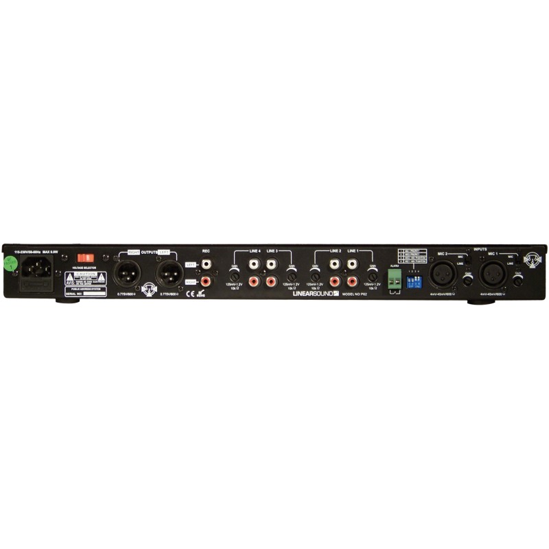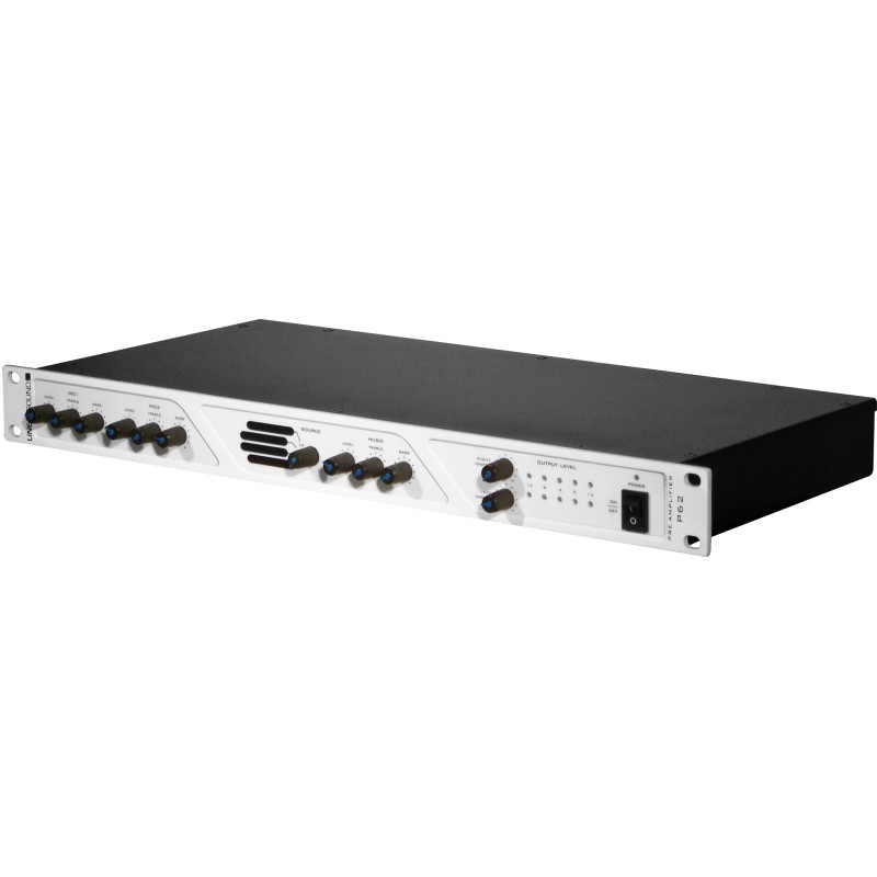 The P62 provides 6 inputs of which 2 balanced MIC inputs with phantom power supply. It also has a stereo and a REC output. On the front panel, each MIC input has bass, treble and level controls. Still on the front panel, the P62 has a source selector (1-4) with bass, treble and level controls. On the Rear panel, the level of each line input can be adjusted : MIC inputs can be set with a selector. A terminal block is on the Rear panel to connect an external security system.Recipient :
