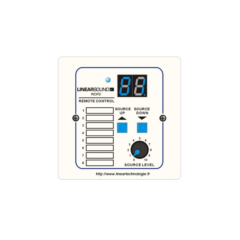 Ce pupitre de télécommande LINEARSOUND pour LTS.MA88, permet de déporter localement dans la zone choisie par exemple, le contrôle de niveau d\'une des 8 sources choisies, les touches source Up et source Down. Le contrôle visuel de la sélection en cours se fait à l\'aide du display. La connexion avec la matrice MA88 se fait par câble CAT 5. La distance maximale entre la télécommande et la matrice est de 50m. Cette longueur peut être portée à 1000m par l\'ajout d\'une alimentation de la télécommande en 24V DC. Le montage de cette plaque peut se faire par encastrement ou en saillie à l\'aide d\'un boitier.Destinataire :