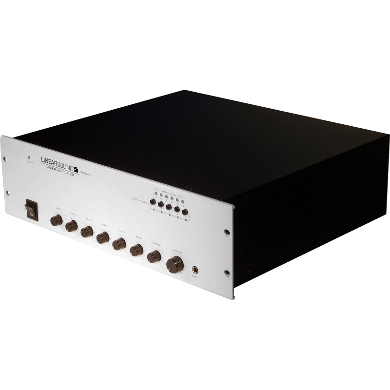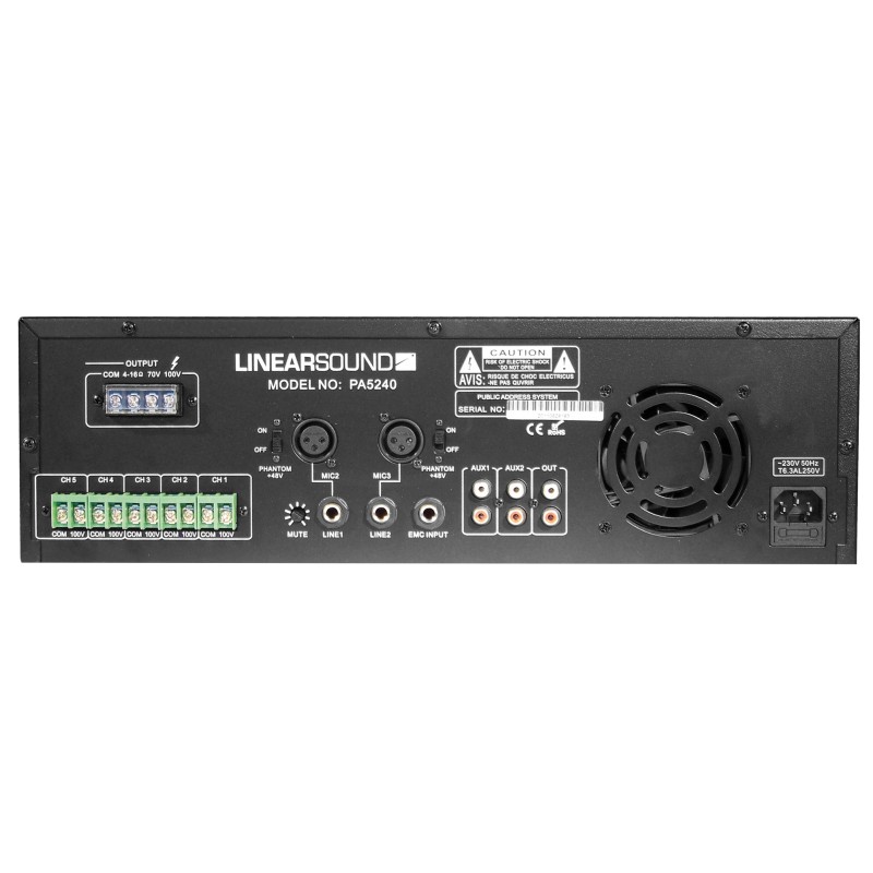Cet amplificateur – préampli, de la gamme LINEARSOUND, propose pour la partie amplification, une puissance totale de 240W, 70V – 100V et 4 – 16 Ohms (les connections de ligne 100V, pouvant se faire sur un bornier 5 zones dont la mise en service est pilotable sur la face avant). Il dispose également d\'un correcteur de tonalités 2 bandes Bass – Aiguës, d\'un contrôle général de volume en face avant, ainsi qu\'un bargraph d\'indication de niveau. Pour la partie préamplificateur, le PA5240 propose, une entrée micro prioritaire avec voice over réglable, 3 entrées MIC dont 2 Mic-Line symétriques commutables avec alimentation fantôme et 2 entrées stéréo LINE-AUX, une sortie Line Pré Out sur RCA. Le PA5240 est totalement protégé contre les court-circuits, les surchauffes et est équipé d\'une ventilation mécanique.Destinataire :
