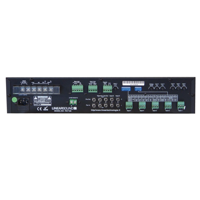 Le PA7120, de la gamme LINEARSOUND, dispose de 2 sorties - 1 sortie 120 et 1 sortie zone 2 de 1W groupée à 1 sortie line à volume réglable (le volume de sortie principale peut être contrôlé à distance par une télécommande déportée) -, d\'un carillon commutable en 2 ou 4 tons avec contrôle du niveau déclenché par une télécommande ou par l\'utilisation de micro pupitre par exemple. Le préamplificateur dispose de 5 entrées micro symétriques, dont 1 est équipée d\'un Voice Over, ainsi que 2 entrées Line stéréo, d\'un pavé de dip-switch permettant différentes combinaisons entre les niveaux Line et Mic, d\'une alimentation fantôme, d\'un contrôle VCA,... Les niveaux d\'entrées et de sorties sont réglables. Le PA7120 dispose également d\'une sortie line Out et d\'une entrée et sortie permettant l\'insertion d\'un traitement audio. Enfin en matière de sécurité, le PA7120 peut être alimenté en 24V DC. Le PA7120 est totalement protégé contre les court-circuits, les surchauffes et est équipé d\'une ventilation mécanique.Destinataire :