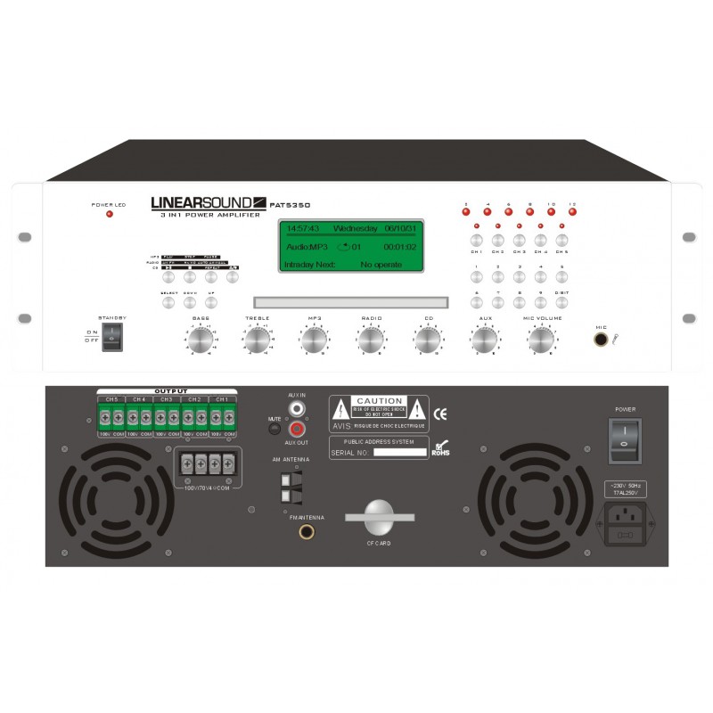 Cet amplificateur – préampli, de la gamme LINEARSOUND, propose pour la partie amplification : 4 sorties : 350W, 70V-100V et 4-16 Ohms, 1 sélecteur de 5 zones commutables en face avant, 1 correcteur de tonalités 2 bandes Bass – Aiguës et 1 contrôle de volume en face avant. L\'indication du niveau général se fait à l\'aide d\'un bargraph à leds. Pour la partie préamplificateur, le PAT5350 propose une entrée micro prioritaire avec Voice Over réglable, 1 entrée line AUX sur RCA, une sortie line Pré Out sur RCA. Ce modèle intègre également un lecteur de CD MP3, un tuner digital AM/FM avec recherche automatique, 50 mémoires et un lecteur de carte Compact Flash. Un accès direct aux morceaux et fonctions peut se faire sur le clavier en face avant. Un minuteur hebdomadaire est également intégré afin de faciliter la programmation de la diffusion musique et messages. Enfin le PAT5350 est protégé contre les court-circuits, la surchauffe et surcharge. Ce modèle est fourni avec sa télécommande infrarouge.Destinataire :