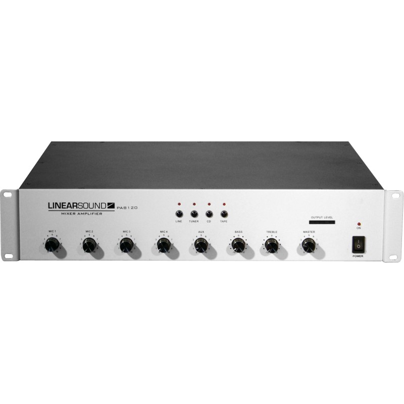 Cet amplificateur préampli, de la gamme LINEARSOUND, dispose de 4 sorties 50V, 70V, 100V ou 4-16Ohms, 4 entrées micros avec une alimentation phantom et priorités, 4 entrées doubles RCA ligne commutable par bouton en face avant. Cet amplificateur fournit également un carillon de 2 ou 4 tons avec contrôle de volume et entrée pour télécommande. Le PA8120 est entièrement protégé contre les courts-circuits, la surchauffe ainsi que la surcharge électrique. Il est également équipé d\'une ventilation asservie. Pour les applications en matière de sécurité, cet amplificateur peut s\'alimenter en 24V DC et dispose d\'une entrée prioritaire.Destinataire :
