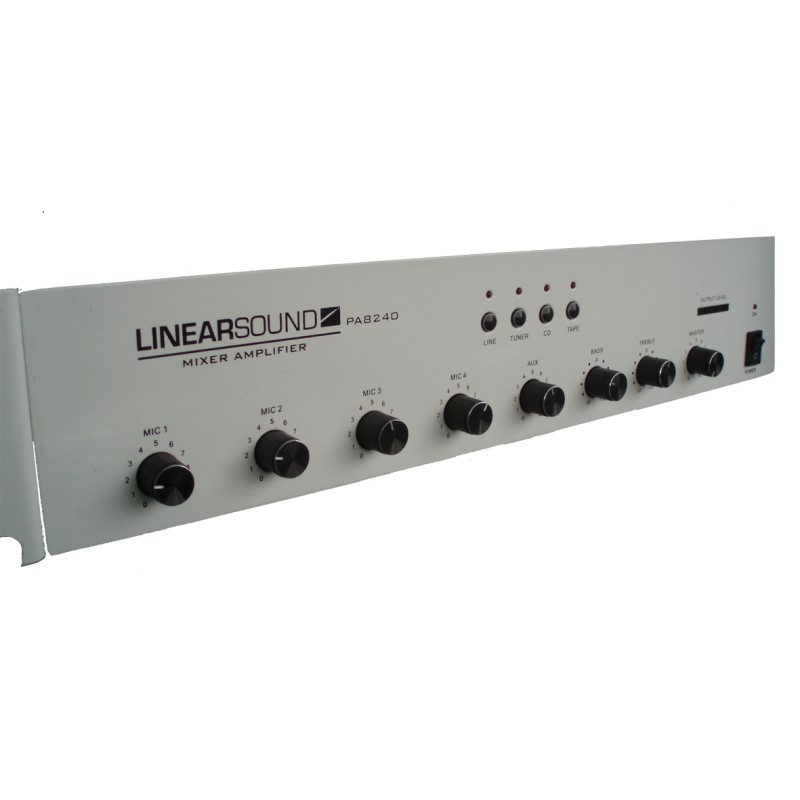 Cet amplificateur préampli, de la gamme LINEARSOUND, dispose de 4 sorties 50V, 70V, 100V ou 4-16Ohms, 4 entrées micros avec une alimentation phantom et priorités, 4 entrées doubles RCA ligne commutable par bouton en face avant. Cet amplificateur fournit également un carillon de 2 ou 4 tons avec contrôle de volume et entrée pour télécommande. Le PA8240 est entièrement protégé contre les courts-circuits, la surchauffe ainsi que la surcharge électrique. Il est également équipé d\'une ventilation asservie. Pour les applications en matière de sécurité cet amplificateur peut s\'alimenter en 24V DC et dispose d\'une entrée prioritaire.Destinataire :