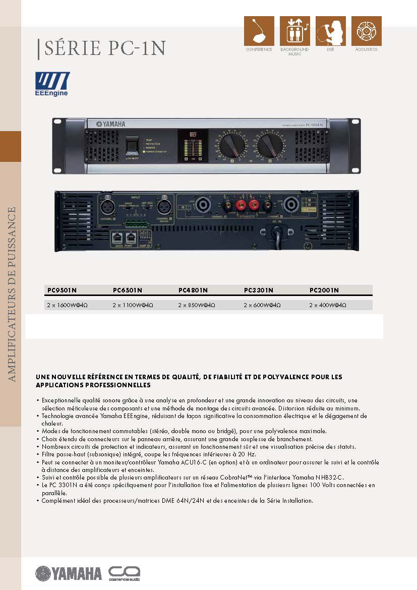 Les nouveaux amplificateurs de la série PC-1N offrent des basses extraordinairement puissantes, une riche plage de moyennes fréquences et des aigus magnifiquement définis. Ils présentent également une réponse rapide et une exceptionnelle stabilité, même en cas d'importantes restrictions en termes d'alimentation.
