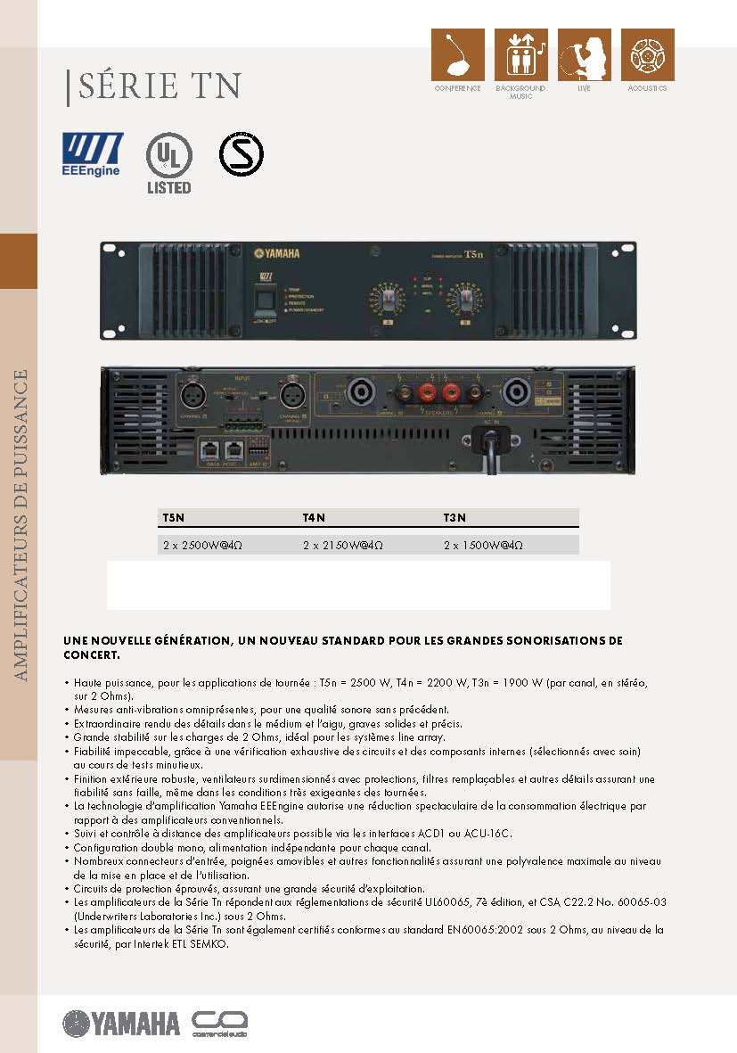 Leur capacité à abaisser l'impédence de charge jusqu'à 2 ohms fait des amplificateurs Tn l'outil idéal pour alimenter des systèmes line-array quand vous êtes en tournée. Grâce à leur système de refroidissement par ventilateur et à leurs circuits de protection, ils font toujours preuve d'une grande fiabilité, et leur consommation d'électricité est 50 % plus faible que celle des amplificateurs conventionnels, ce grâce à EEEngine, la technologie à haute efficacité développée par Yamaha. La série Tn dispose évidemment de capacités intégrées de mise en réseau pour le contrôle et la surveillance à distance.