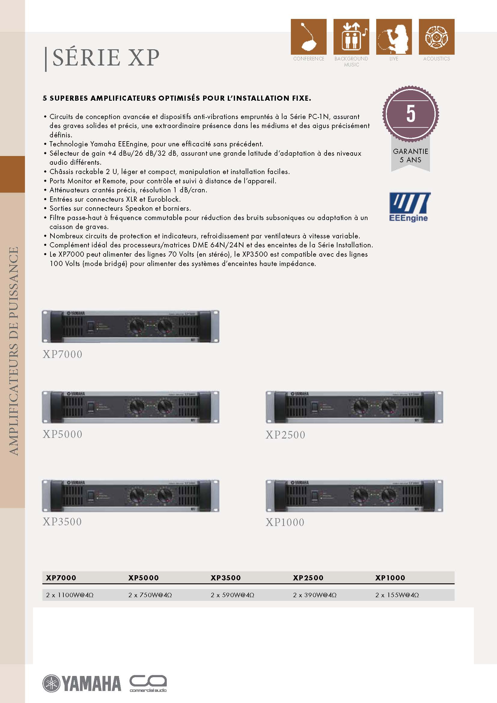 La série XP de Yamaha propose cinq modèles d'amplificateurs de puissance destinés aux installations sonores et capables de fournir un son de grande qualité à un prix très compétitif. Ces amplificateurs se caractérisent par une haute puissance, une qualité sonore exceptionnelle, une fiabilité éprouvée et une stabilité supérieure.