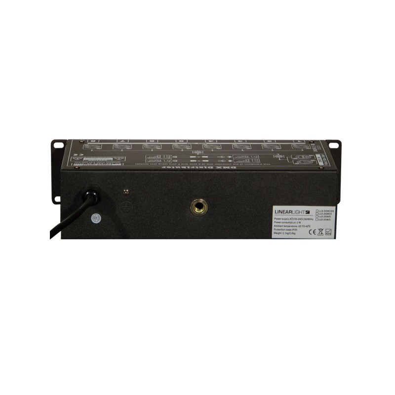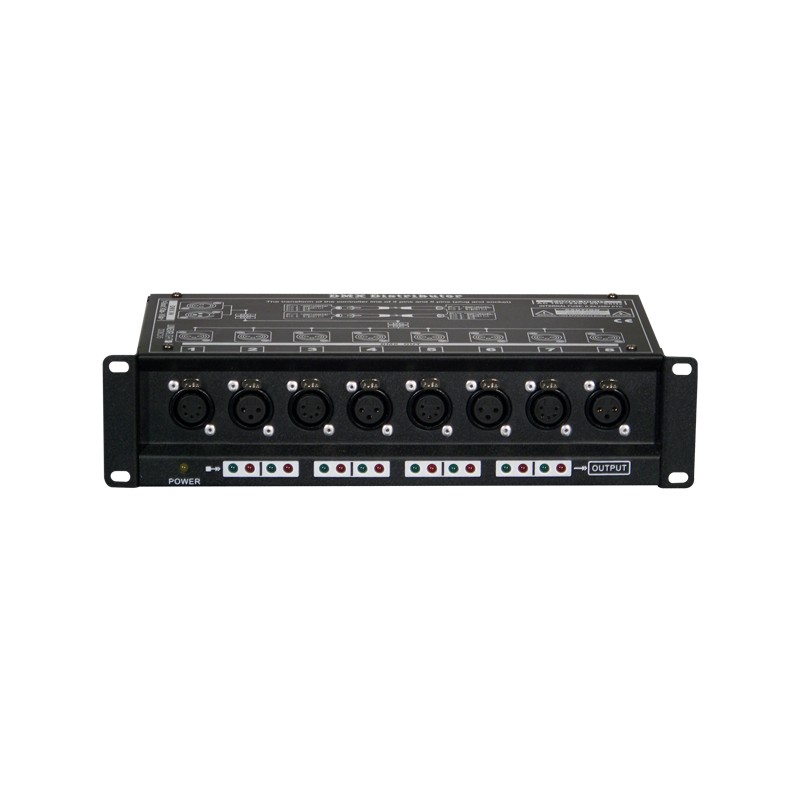 Ce distributeur DMX compact dispose d’une entrée, de 4 sorties isolées XLR 3 broches et 4 sorties XLR 5 broches. Il est équipé d’un insert femelle M10 pour une fixation avec un crochet sur une structure aluminium.
