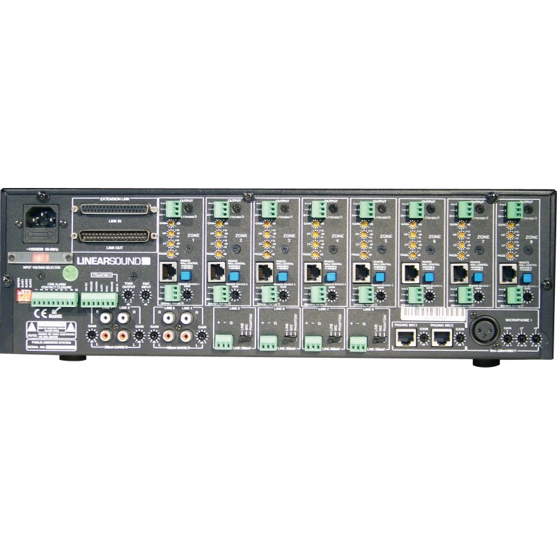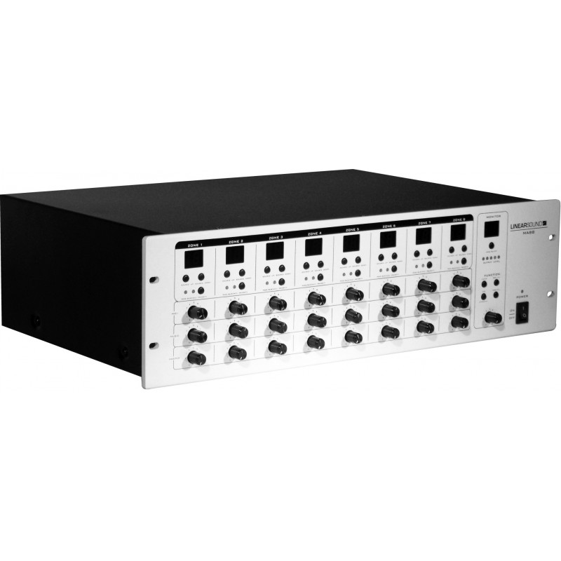 Cette matrice numérique LINEARSOUND dispose de 8 entrées locales Line (1 à 4) et Mic / Line symétrique commutable (5 à 8) avec contrôle de gain d'entrée et niveau de sortie, 1 entrée Mic avec contrôle de gain et correcteur de tonalités 2 bandes, 2 entrées micro pupitre d'appels, 8 sorties symétriques.