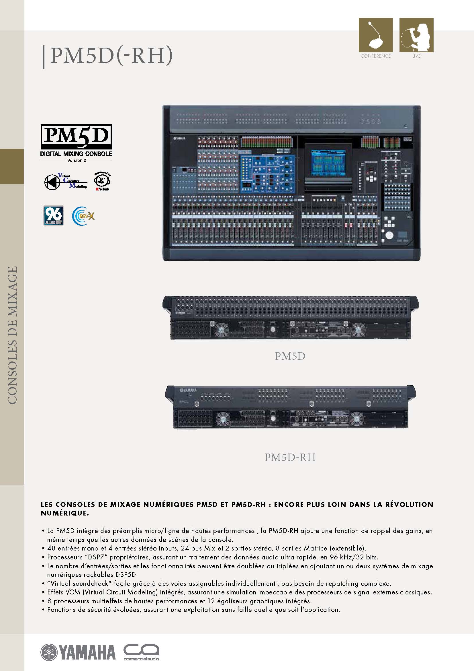 La PM5D est la console de référence pour le mixage "live" et les installations de mixage en théâtre et en broadcast. Deux modèles sont disponibles : la PM5D avec des préamplis micro de type DM2000 et la PM5D-RH équipée de préamplis micro issus de ceux de la PM5000 dont les gains sont mémorisables.