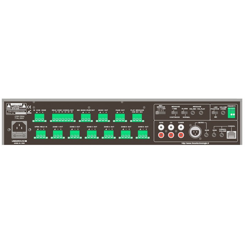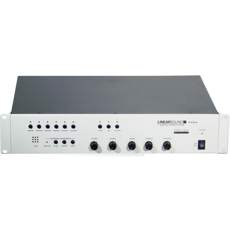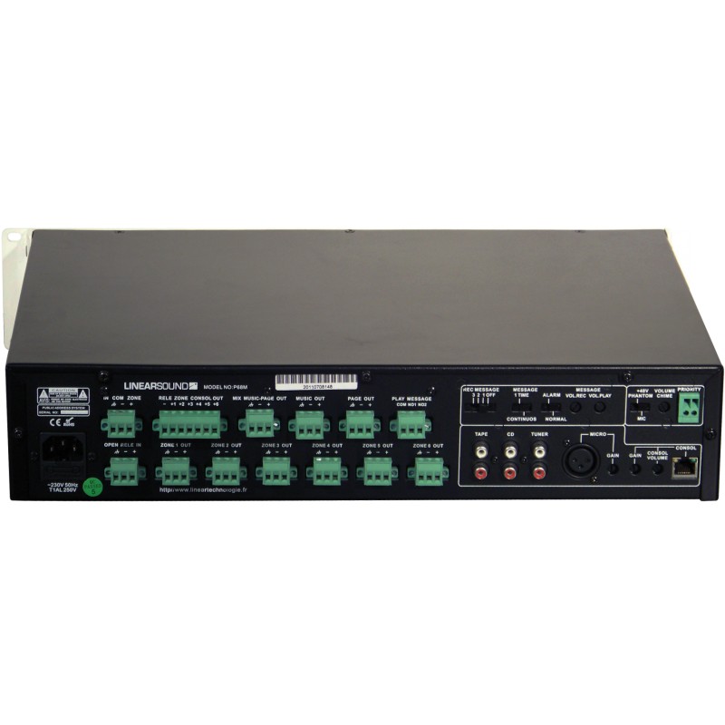 Le P68M, de la gamme LINEARSOUND, dispose de 3 entrées LINE, d\'une entrée MIC prioritaire avec alimentation fantôme et gain d\'entrée réglable, d\'un carillon avec réglage de niveau et d\'un lecteur enregistreur numérique de 3 messages de 60 secondes chacun. Le P68M intègre toutes les fonctions pour enregistrer un message : micro réglage des niveaux d\'entrée et de sortie. Ces messages choisis peuvent être diffusés une fois ou en continu (sélecteur en face arrière). Un connecteur pour la prise de contrôle prioritaire de sécurité se trouve à l\'arrière ainsi qu\'un connecteur pour un micro pupitre prioritaire qui peut éventuellement déclencher les messages. Un sélecteur 6 touches permet d\'affecter le programme musical sur 6 zones (connecteurs de sortie symétrique à l\'arrière). Le P68M offre, également une sortie symétrique mono music & mic mixée, une music, et une uniquement micro. Le réglage des niveaux, micro, musique, bass, aiguë, général se trouve en face avant. Un bargraph à leds indique le niveau de sortie.Destinataire :